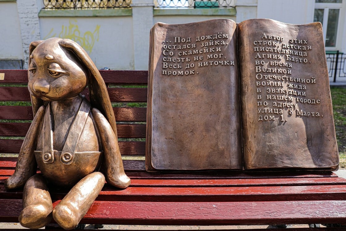 - В Екатеринбурге есть памятник детям, эвакуированным на Урал в годы Великой Отечественной войны. Скульптура выполнена в виде грустного Зайки рядом с открытой книгой. В книге строки известного стихотвореня Барто.
