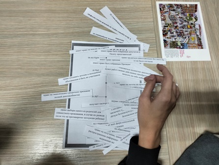 Основное внимание было уделено практике: в формате игр молодые люди разбирали, как права работают в реальных ситуациях, анализировали, где проходит грань между нарушением права и моральной нормой, создавали собственные «Декларации прав» для футуристических обществ.