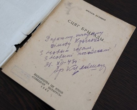 Статья посвящена дарственным надписям белорусских писателей из собраний Государственного музея истории белорусской литературы. В числе прочих, упоминаются и автографы слутчан – дарственные надписи Аркадия Кулешова и Пимена Панченко уроженцу д. Евличи Слуцкого района, детскому писателю и поэту Василю Витке, а также подпись стихов Анатоля Астрейко, посвященная автору, уроженцу д. Старево Слуцкого района, литературоведу Степану Майхровичу.