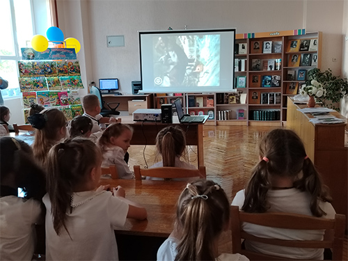 Завершилась встреча просмотром мультфильма «Домовёнок Кузя» и обзором книжной выставки «Мир начинается с детства».
