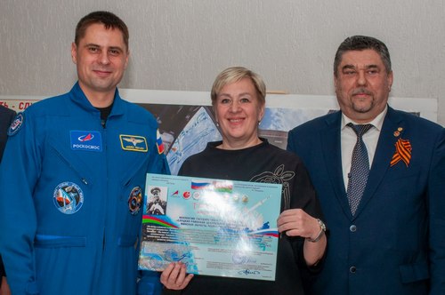 Представители российской делегации: автор-организатор проекта «Космос объединяет поколения Союзного государства», конкурса детского рисунка «Славные страницы истории братских народов России и Беларуси – Мы вместе», координатор-организатор программ мероприятий в Российской Федерации и Республике Беларусь, специалист «Центрального военного клинического госпиталя имени П.В. Мандрыка» Министерства обороны Российской Федерации Сидоров Андрей Витальевич и летчик-космонавт, Герой Российской Федерации Федяев Андрей Валерьевич вручили грамоту специального представителя Президента Российской Федерации по международному сотрудничеству в космосе коллективу Государственного учреждения «Слуцкая районная центральная библиотека».