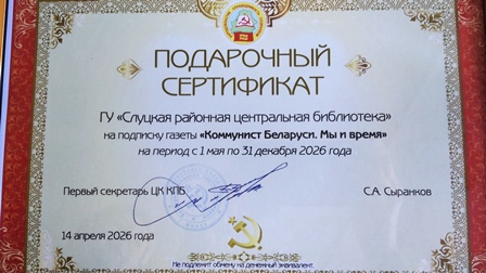 Первый секретарь ЦК Коммунистической партии Беларуси Сыранков Сергей Александрович вручил директору Государственного учреждения «Слуцкая районная центральная библиотека» Гуринович Людмиле Васильевне подарочный сертификат на подписку газеты «Коммунист Беларуси. Мы и время» с 1 мая по 31 декабря 2025 года.