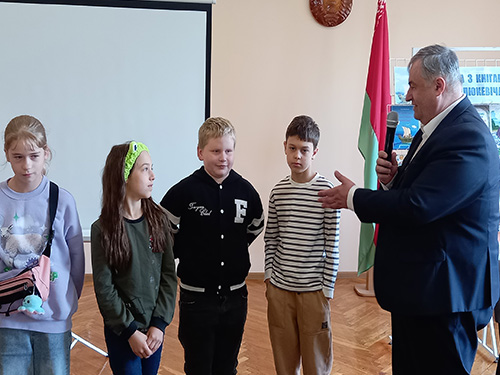 Юныя случчане зрабілі фотаздымак на ўспамін аб сустрэчы з аўтарам.