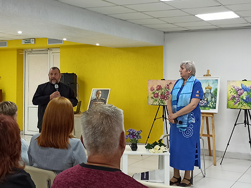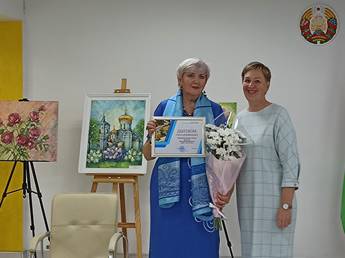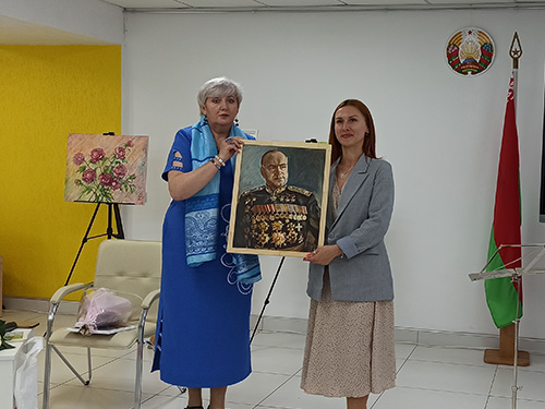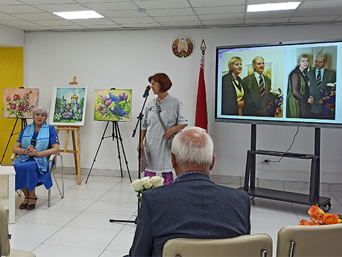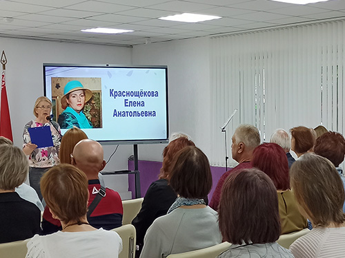 Встречу и выставку Елена Краснощекова посвятила 80-летию Победы советского народа в Великой Отечественной войне, 1020-летию родного города Слуцка, своему наставнику — Владимиру Степановичу Садину и всем своим землякам.