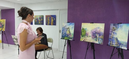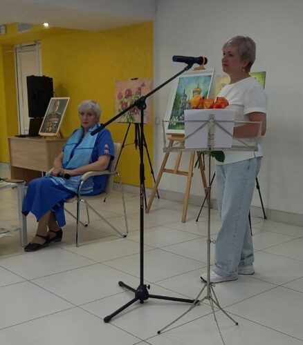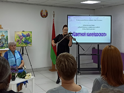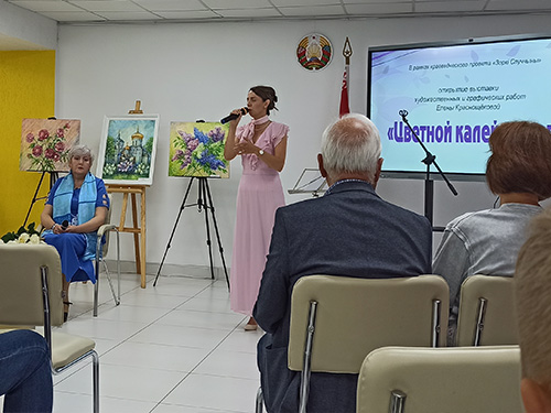 27 июня 2025 года в отделе обслуживания и информации Слуцкой районной центральной библиотеки состоялась встреча с художником Еленой Анатольевной Краснощековой, а также открытие ее персональной выставки «Цветной калейдоскоп». Мероприятие проходило в рамках краеведческого проекта «Зоркі Случчыны».