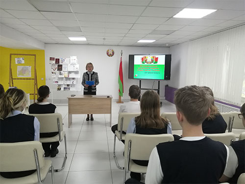 Учащиеся узнали о том, что государственная символика является воплощением национальной идеи белорусского государства. В форме вопросов и ответов участники мероприятия обсудили историю становления и развития Государственного герба, Государственного флага и Государственного гимна Республики Беларусь, обозначение символов и цвета на гербе и флаге нашей страны, смысл и содержание гимна.