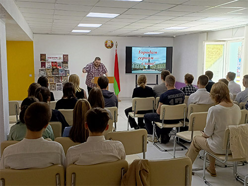 Библиотекарь рассказал учащимся ГУО «Средняя школа №6 г. Слуцка» про героические события, связанные с обороной населенных пунктов, которые впоследствии получили звания городов-героев, про вклад этих событий в победоносное окончание той войны, а также с боевой историей города-героя Минска и Брестской крепости-героя.